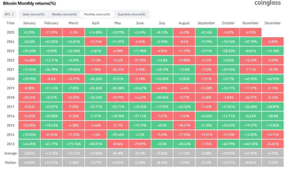 Historical data from Coinglass shows that November has frequently been a month of significant gains for Bitcoin.