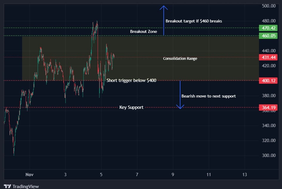 On the downside, a break below $400 could trigger a correction toward $364, where buyers are likely to defend the bullish structure.
