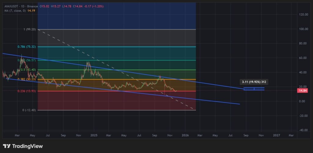 AVAX holds a market cap of $6.47 billion, and the price trades near $15. The coin is up 7% in the past 24 hours, showing stronger short-term performance than many large-cap assets.