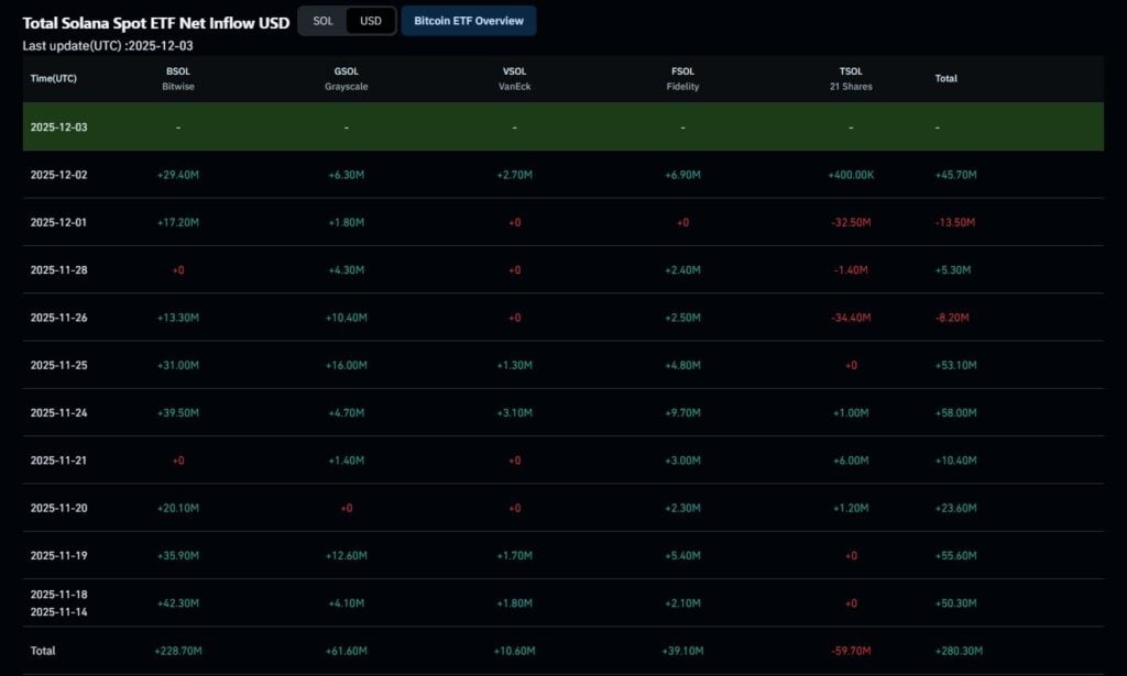 Solana brought in roughly $45 million in fresh inflows in a single day, showing that momentum has turned strongly positive again.