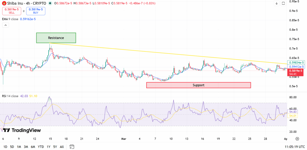 The 4-hour chart indicates the asset may move as projected. SHIB has consolidated below the descending resistance line. The asset has the potential to move above the line. The asset may move above the line because the asset has consolidated below the line.