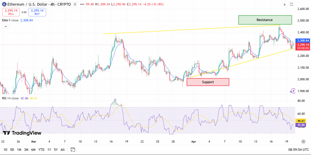 Ethereum continues to be in the spotlight since the coin did not manage to sustain its upward move beyond the $2,400 resistance level. From analysis, the coin was rejected several times in the proximity of the upper limit of its ascending trend channel, pointing to significant selling pressure.