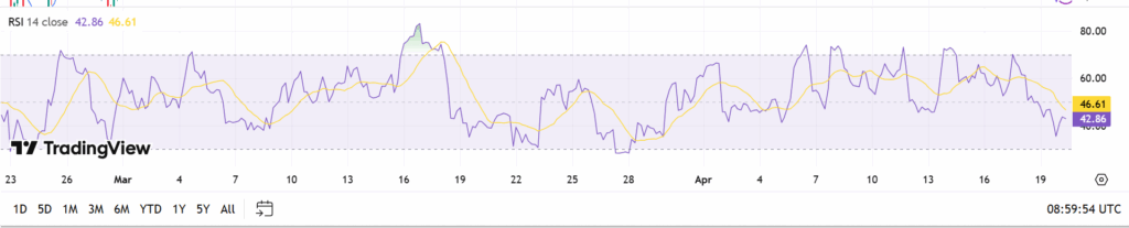 The technical indicators will help understand the existing analysis regarding the prediction of the current price of Ethereum. According to the Relative Strength Index, the present value of the RSI is located within the 40 middle level range. Therefore, the present trend is considered to be neutral or slightly bearish.
